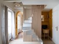 Les matériaux sélectionnés reflètent une ambiance estivale, mêlant bois de bouleau clair, briques apparentes, et des tons chauds de terre cuite, évoquant une atmosphère balnéaire au cœur de Paris. L’appartement se distingue désormais par un espace de vie lumineux, grâce à l’utilisation intelligente des miroirs, des éléments sculpturaux et de la lumière naturelle provenant des fenêtres et des lucarnes.