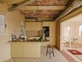 From rough textures of lime mortar and exposed brick on the existing load-bearing wall (interior area) to smooth, whitewashed walls (exterior area).